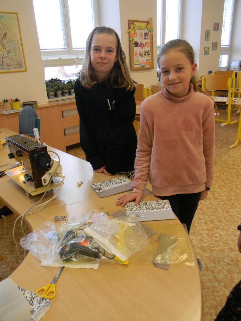 Děvčata se učí šít na šicím stroji.