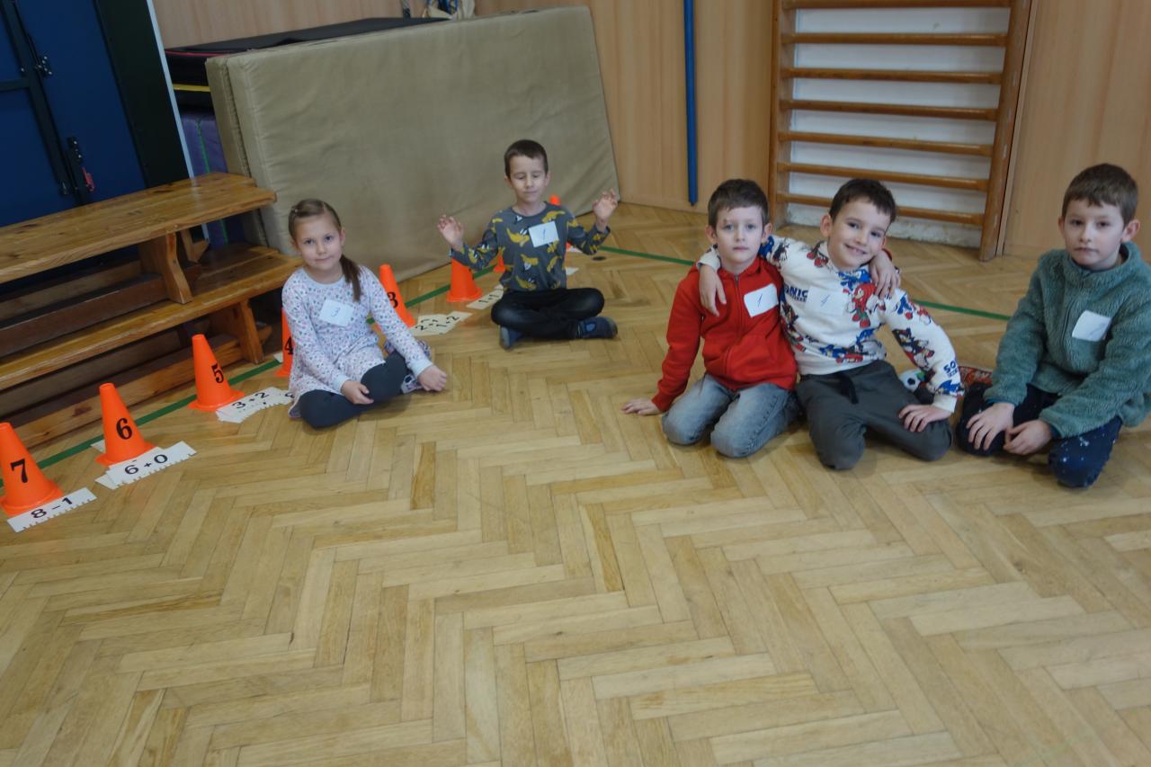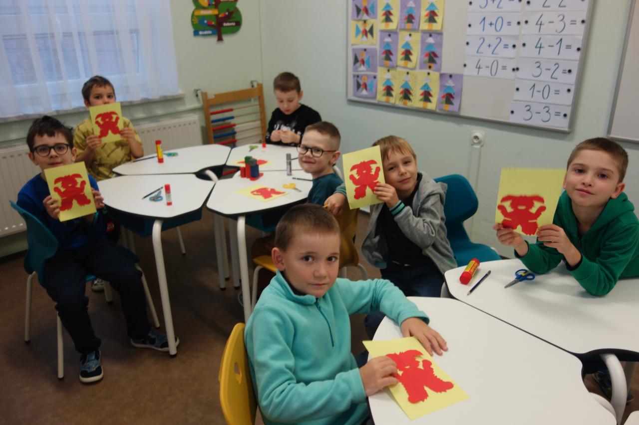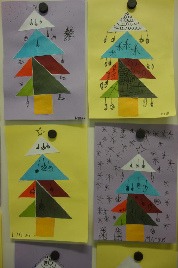 Naši nejmenší v hodinách matematiky skládali vánoční tangramy, stříhali čerta dle osové souměrnosti, jednu hodinu si započítali v tělocvičně a trochu se u toho i protáhli.