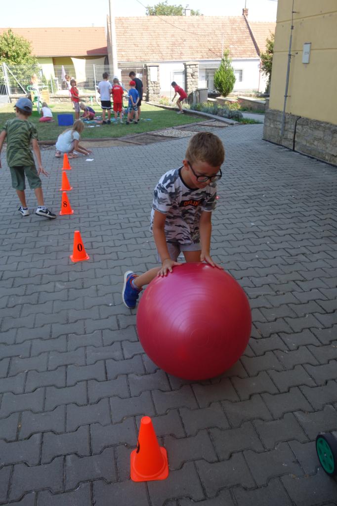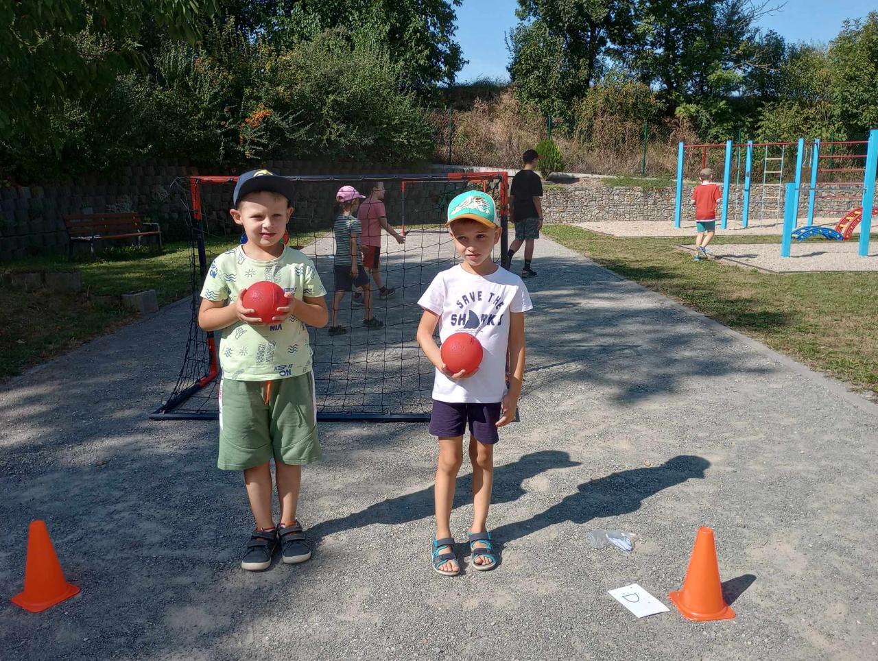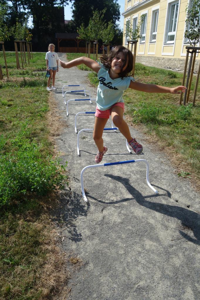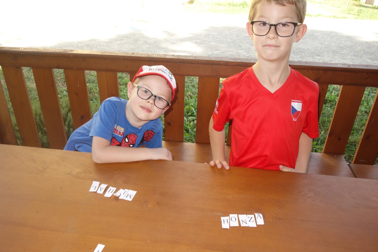 Žáci 4. ročníku si pro prvňáčky připravili jednoduché sportovní úkoly. Za jejich splnění získávali prvňáci písmenka, ze kterých za pomoci starších kamarádů poskládali svoje jméno.